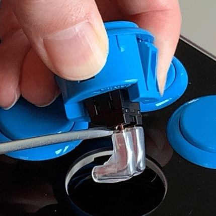 Here's the easy low stress way to remove the buttons. Reach under, squeeze the sides with your fingers and push them up through the top. Then use a small screw driver in a twisting motion to remove the connector. Replace each button one at a time to preserve the original wiring neatness. Be careful not to push the connectors on with one finger, to prevent accidentally bending them over. The pins are delicate. Use a controlled pinch-grip to replace the connectors. They also don't fully seat flush, so no need to force them all of the way home.
